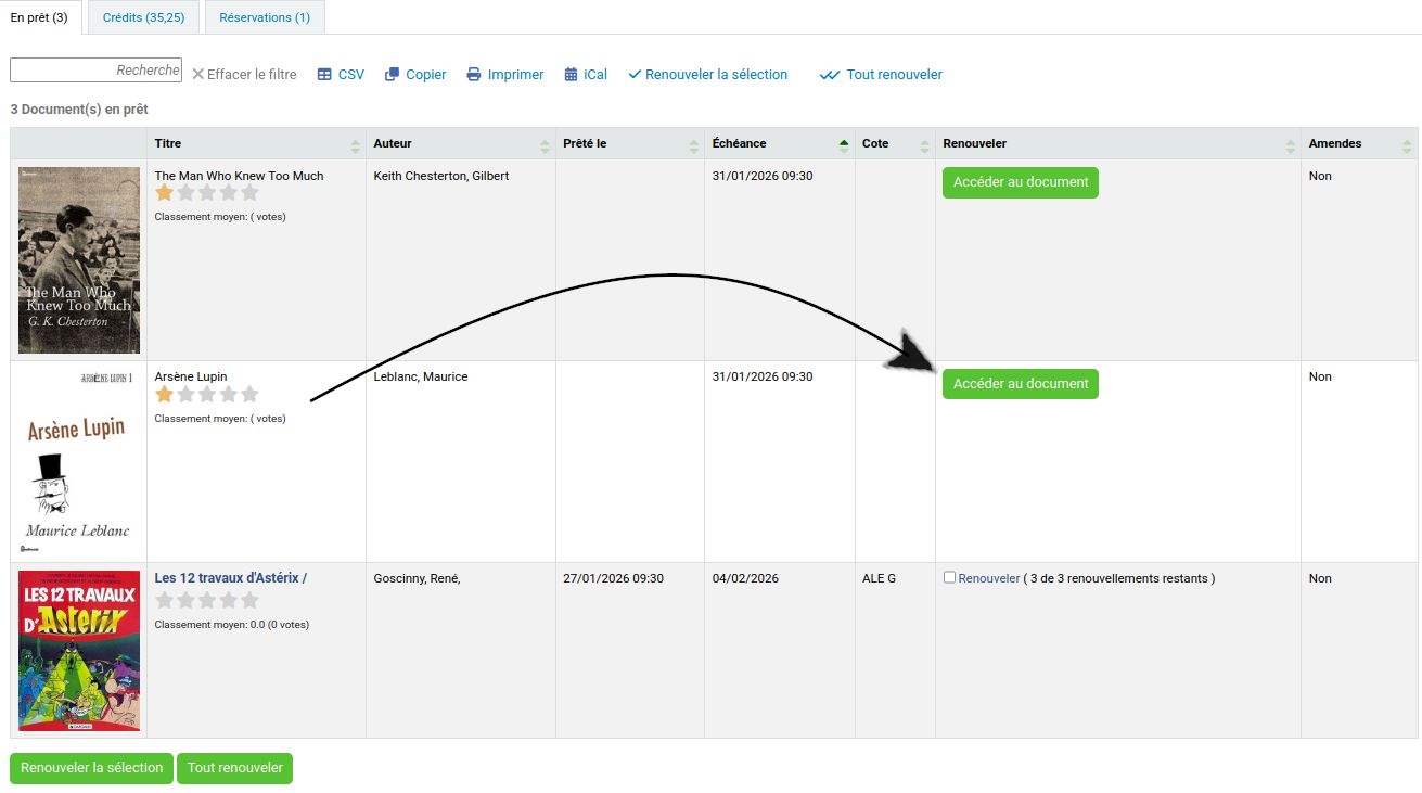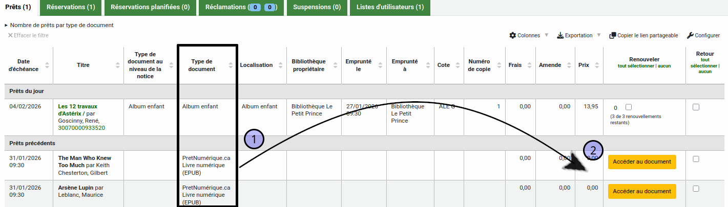 En consultant le dossier de l’utilisateur dans l’intranet, il est facile de reconnaître les documents empruntés sur pretnumerique. Ceux-ci auront un type de document « livre numérique » et un bouton « Accéder au document » qui redirige vers la notice sur le site pretnumerique.