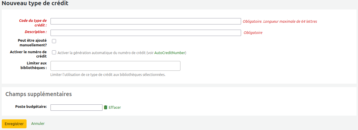 Formulaire d'ajout d'un type de crédit avec un champ supplémentaire