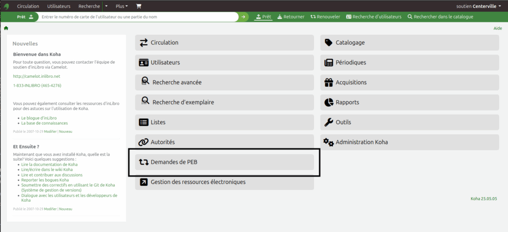 À partir de la version 24.11 de Koha (25.05 pour les clients d’inLibro), le module de prêts entre bibliothèques est complètement intégré à Koha et ne requiert plus d’installation ou de maintenance à part de Koha.