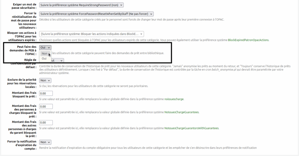 - Changer le paramètre « Peut faire des demandes de PEB à l’OPAC » pour « Non »