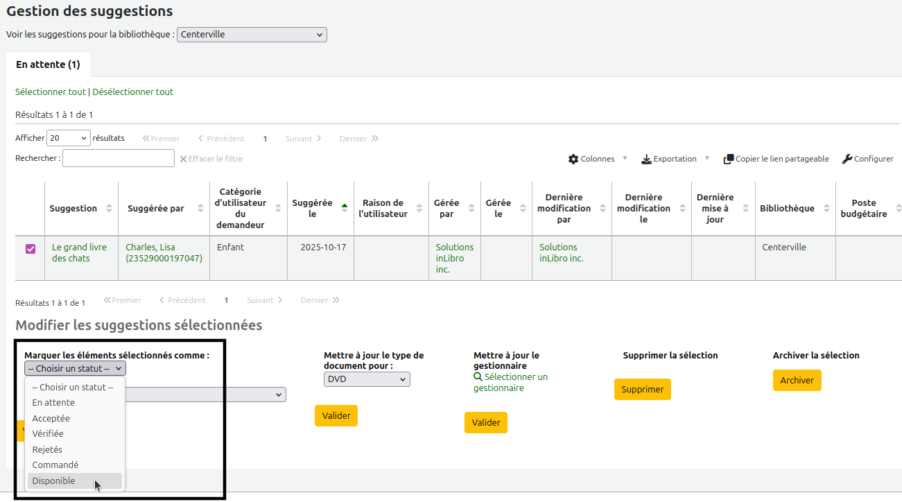 Page de gestion des suggestions. Une suggestion est cochée. Le menu déroulant "Marquer les éléments sélectionnés comme" est ouvert et le curseur est sur l'option "Disponible".