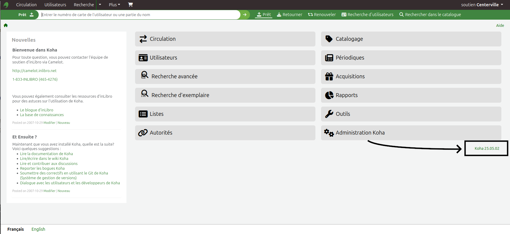 Page principale de l'intranet de Koha. Le lien du numéro de version est mis en évidence.